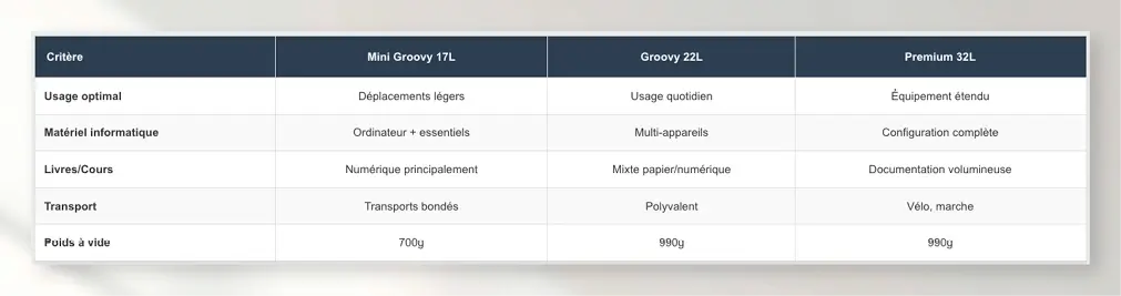 Le choix entre nos trois modèles Eptagon dépend principalement de votre rythme de vie, du volume d’équipements que vous transportez et de la diversité de vos activités quotidiennes.